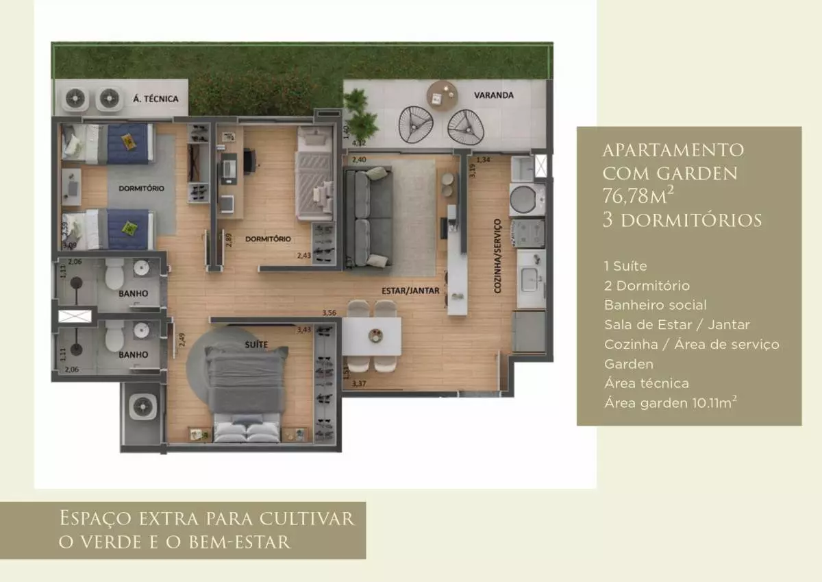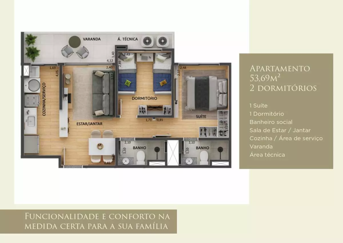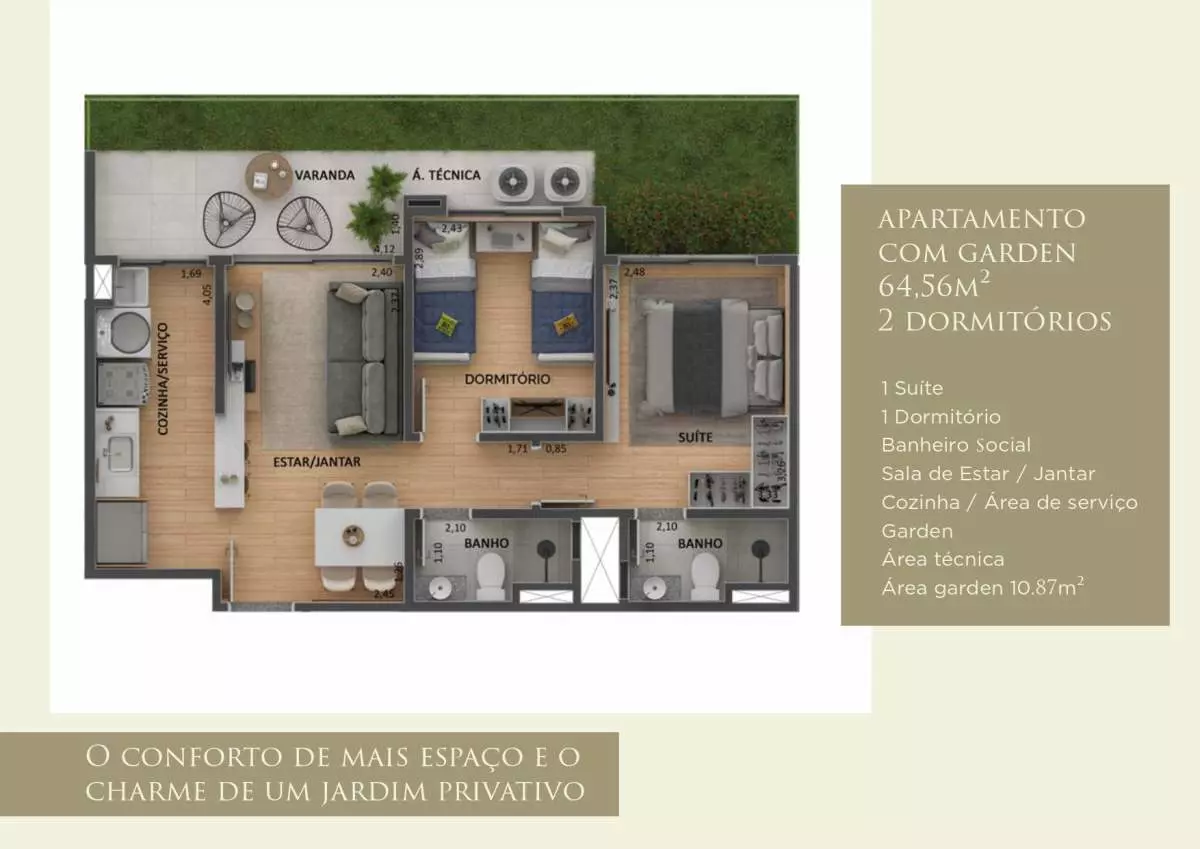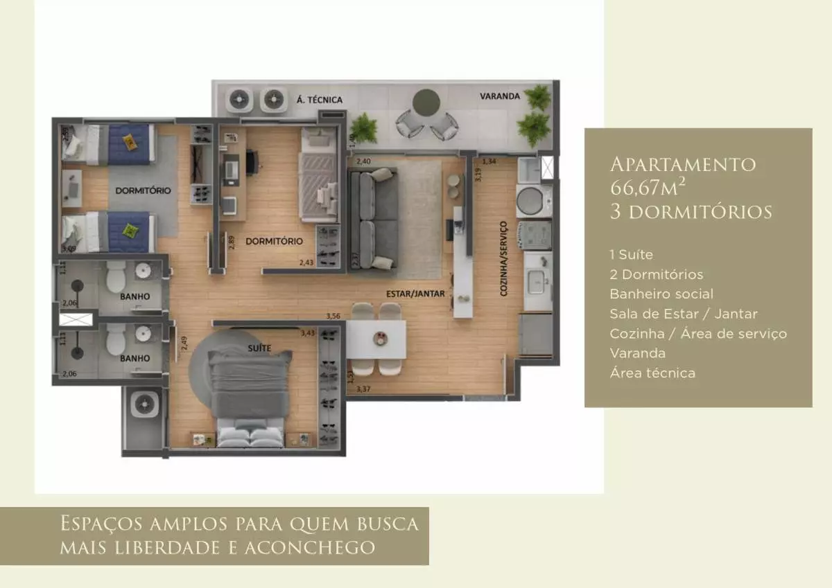 O Parque das Torres oferece apartamentos com metragens de 53,69 m² e 66,67 m², com 2 e 3 dormitórios, todos com suíte e varanda. Algumas unidades contam com garden, proporcionando um espaço adicional para lazer e convivência. As plantas foram cuidadosamente planejadas para otimizar os espaços, oferecendo conforto e funcionalidade para os moradores.